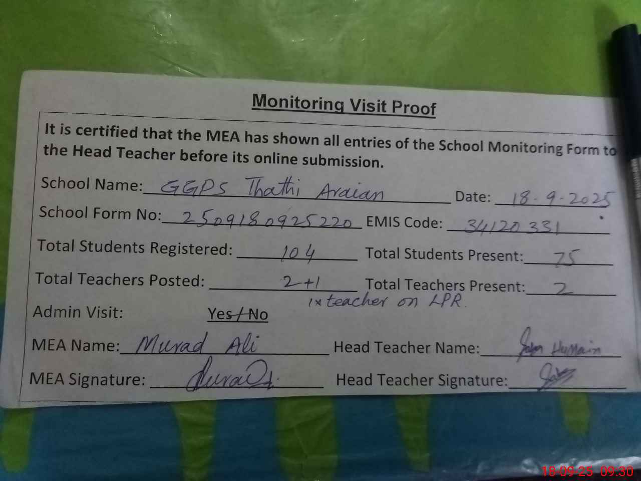 | Attendance Register | Head Teacher | MEA with School | Visit Proof |