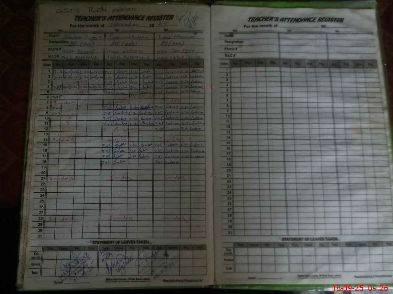 | CNIC | Full Name | Designation | R/C | Absence During Last Calender Month |