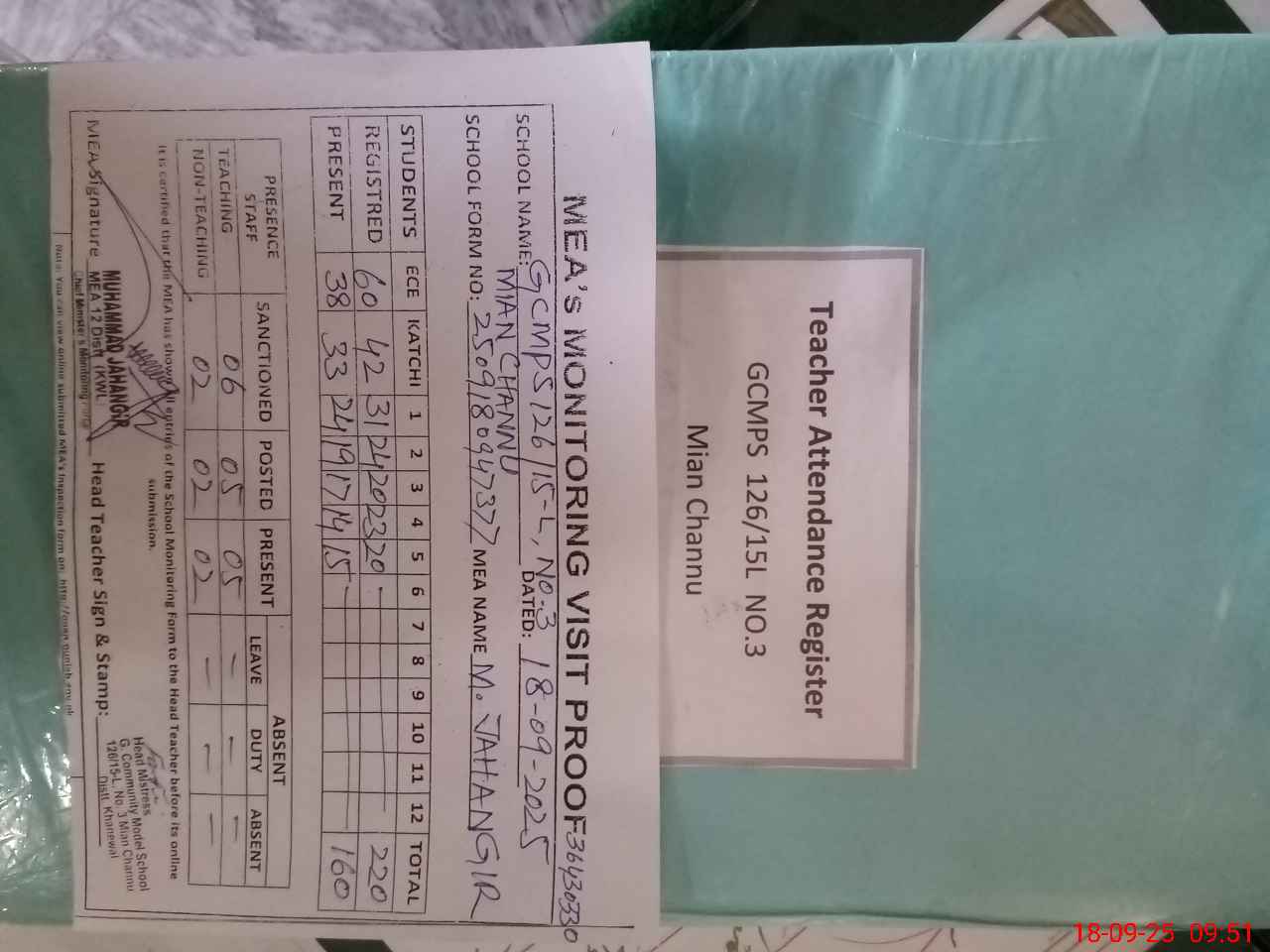 | Attendance Register | Head Teacher | MEA with School | Visit Proof |