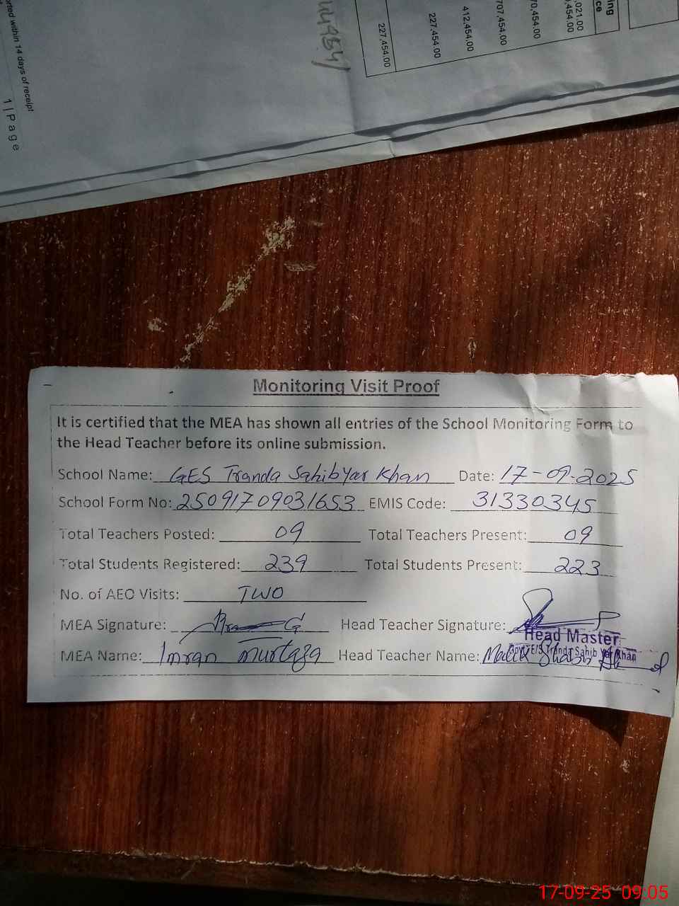 | Attendance Register | Head Teacher | MEA with School | Visit Proof |