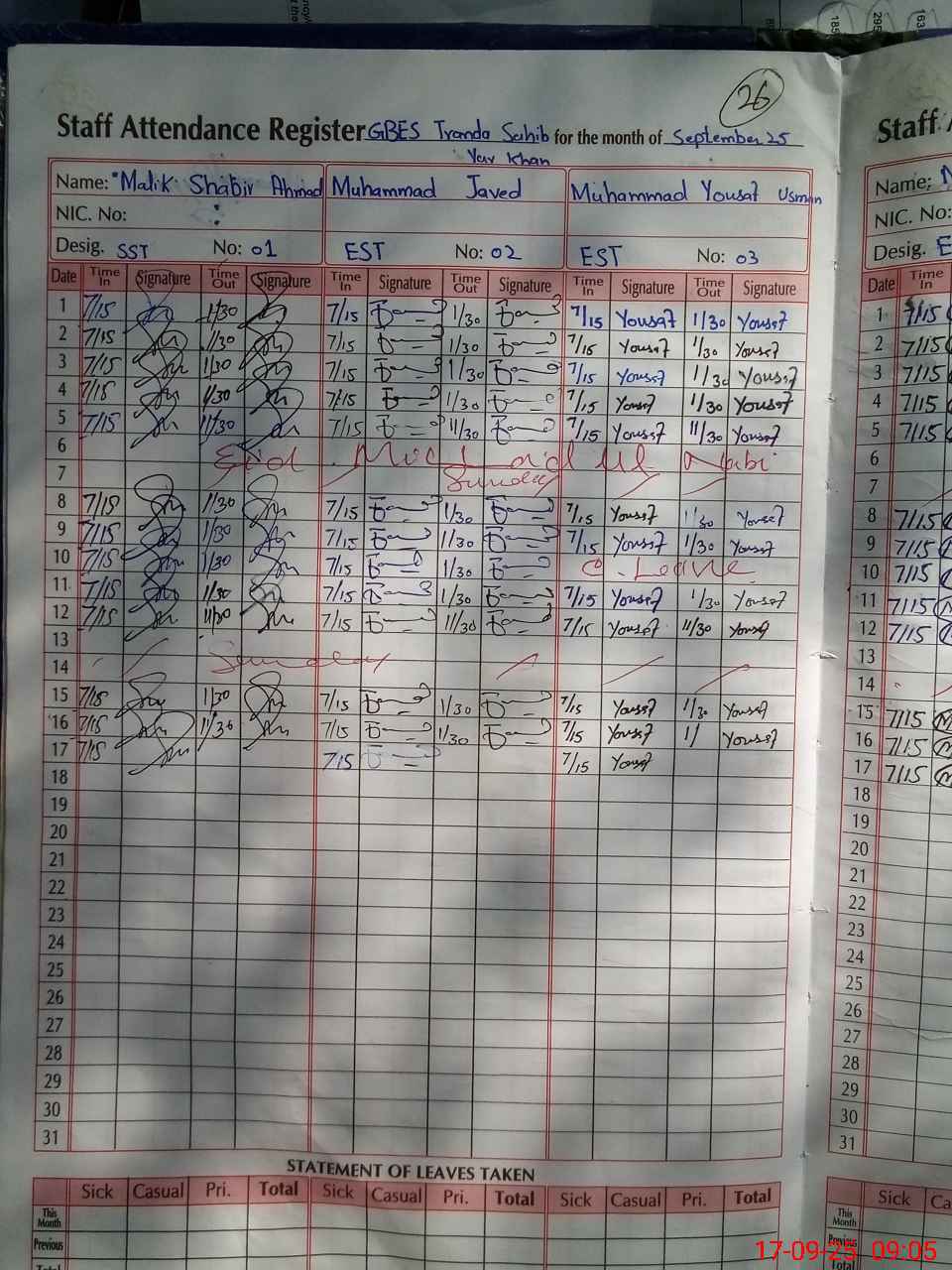 | CNIC | Full Name | Designation | R/C | Absence During Last Calender Month |