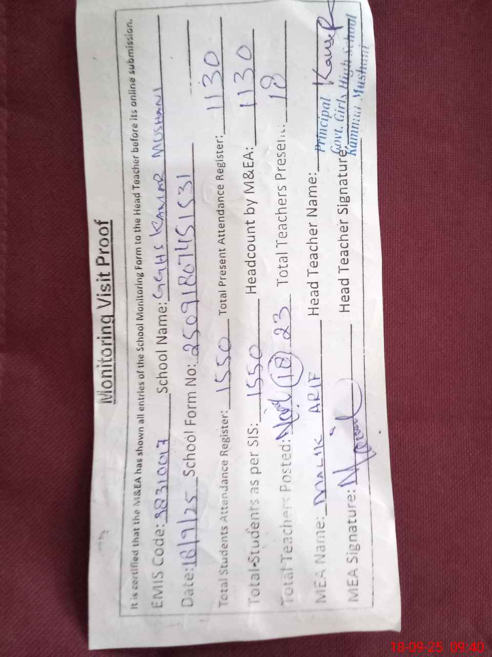 | Attendance Register | Head Teacher | MEA with School | Visit Proof |