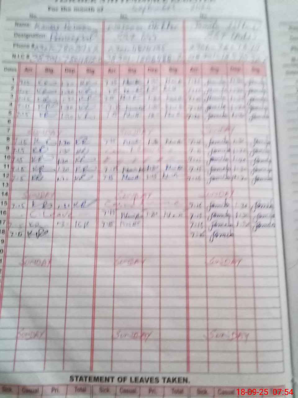 | CNIC | Full Name | Designation | R/C | Absence During Last Calender Month |