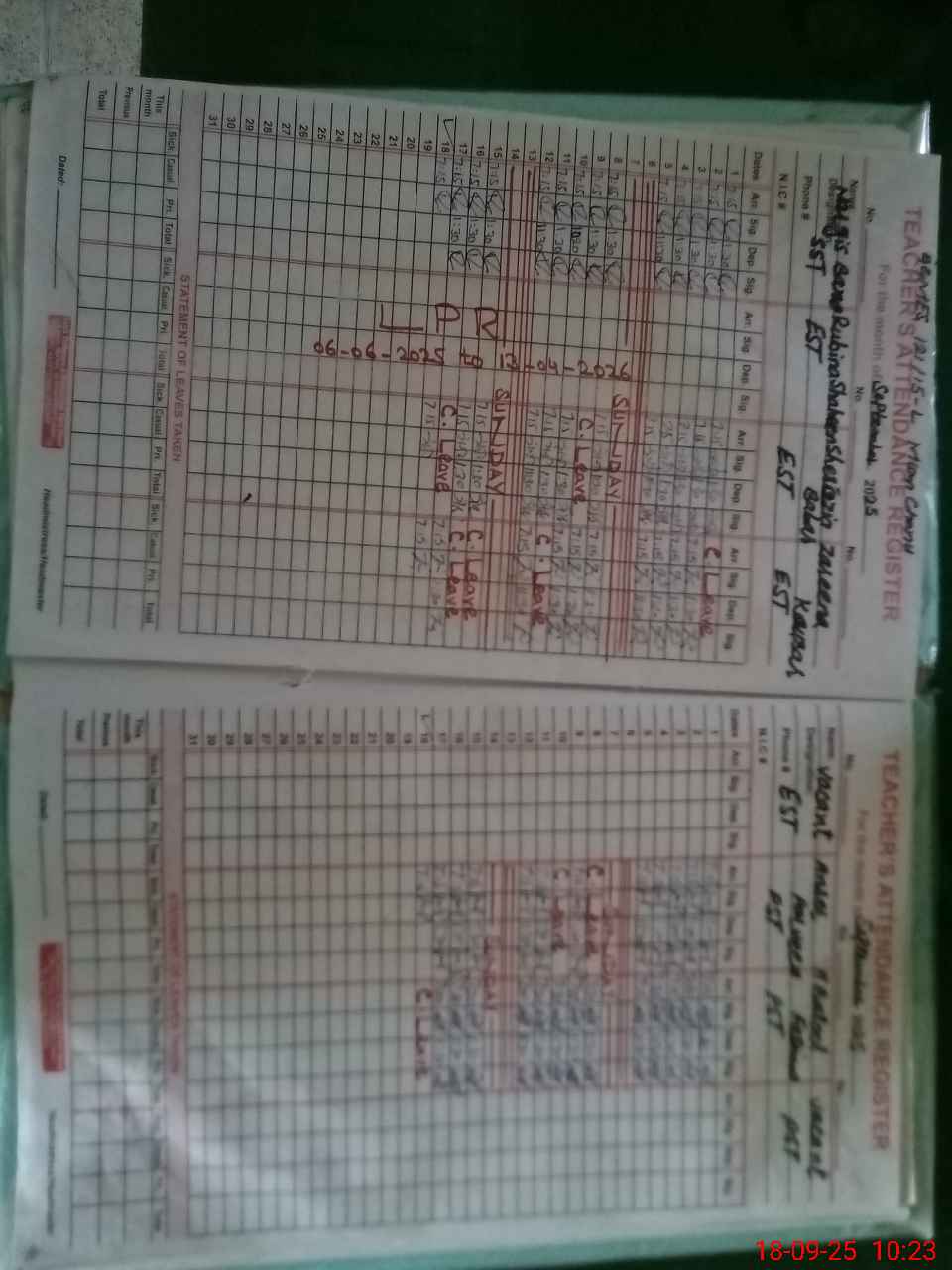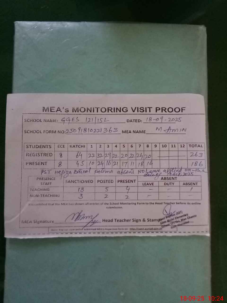 | Remarks (Use Separate Page if Required): PST Hafiza Batool Fatima found absent with out leave No Leave applied for the date of today 0n 18 September 2025 | |||||