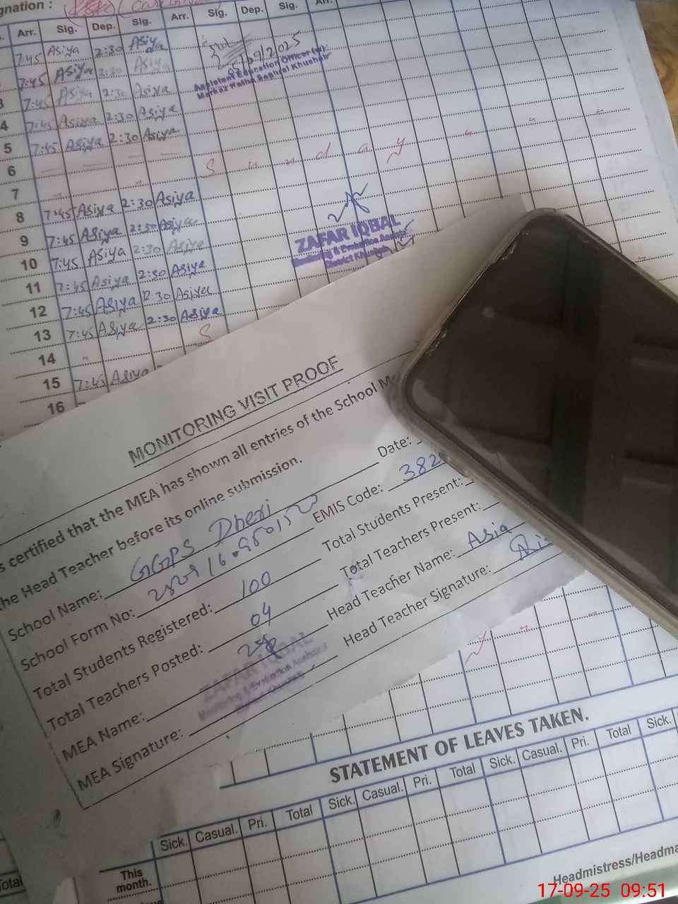 | Attendance Register | Head Teacher | MEA with School | Visit Proof |