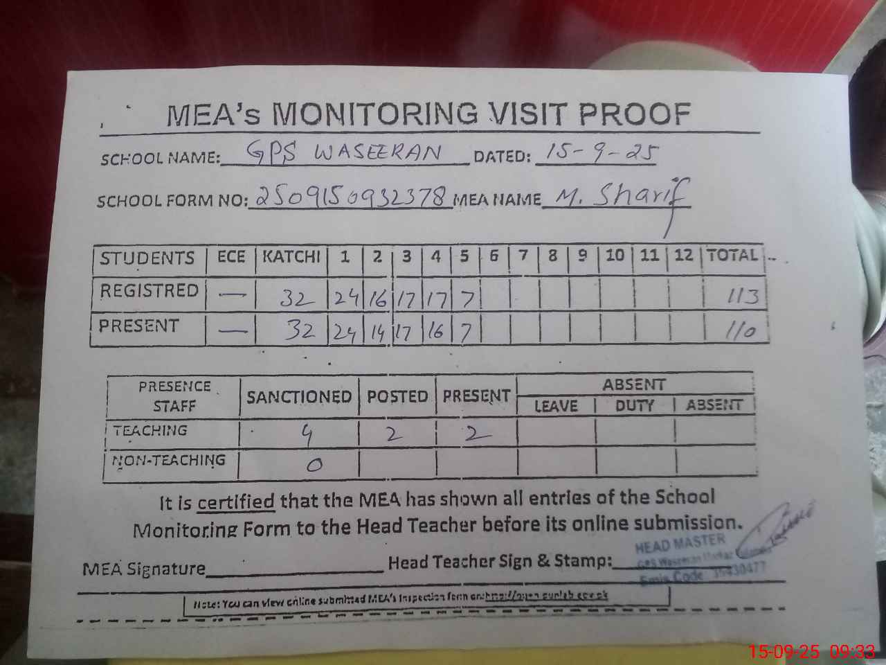| EMIS Code: 36430477 | Name of School: GPS WASEERAN P/O TULAMBA | |||
