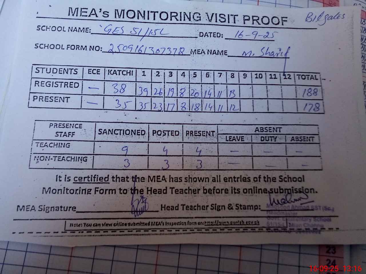 | Attendance Register | Head Teacher | MEA with School | Visit Proof |