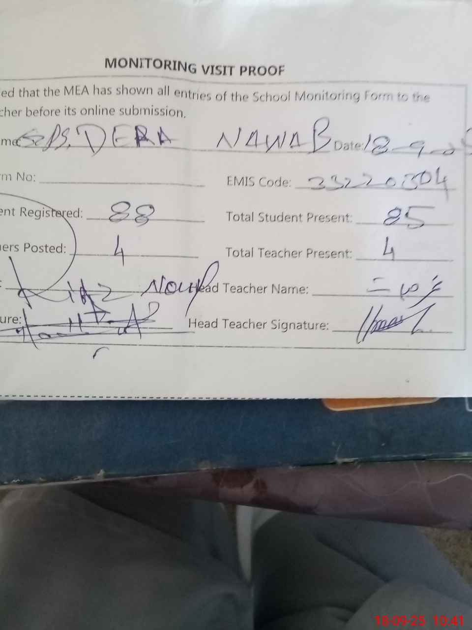 | Attendance Register | Head Teacher | MEA with School | Visit Proof |