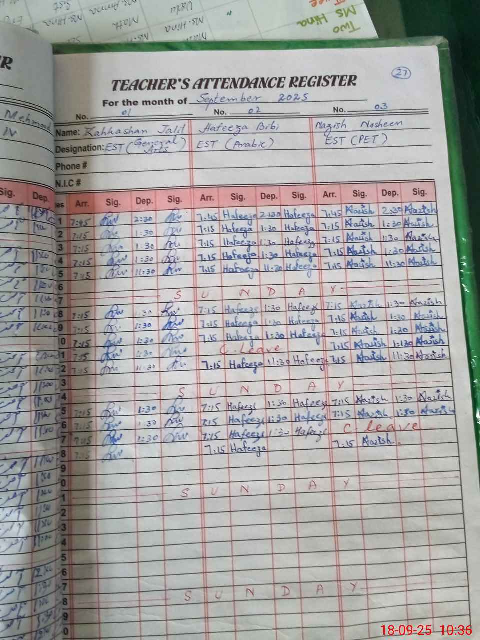 | CNIC | Full Name | Designation | R/C | Absence During Last Calender Month |