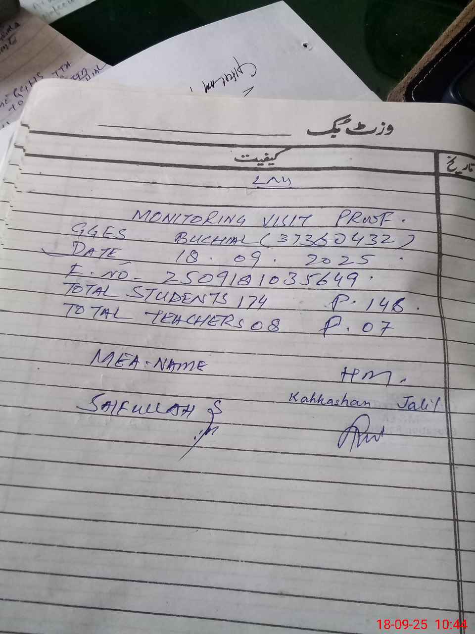 | Attendance Register | Head Teacher | MEA with School | Visit Proof |