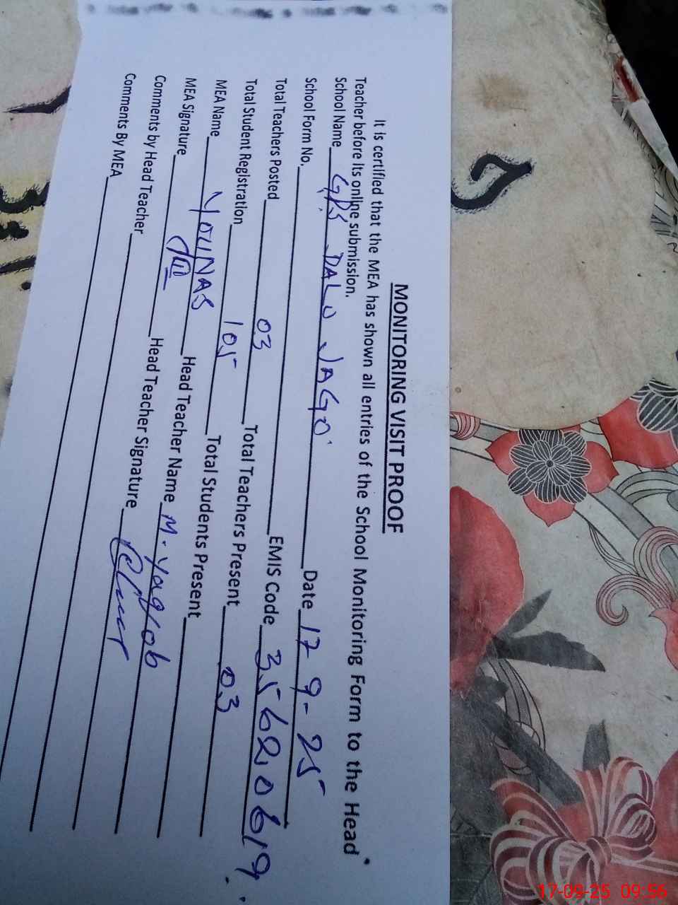| Attendance Register | Head Teacher | MEA with School | Visit Proof |