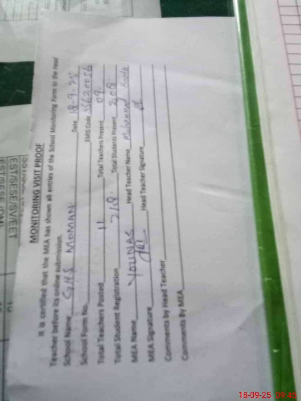 | Attendance Register | Head Teacher | MEA with School | Visit Proof |