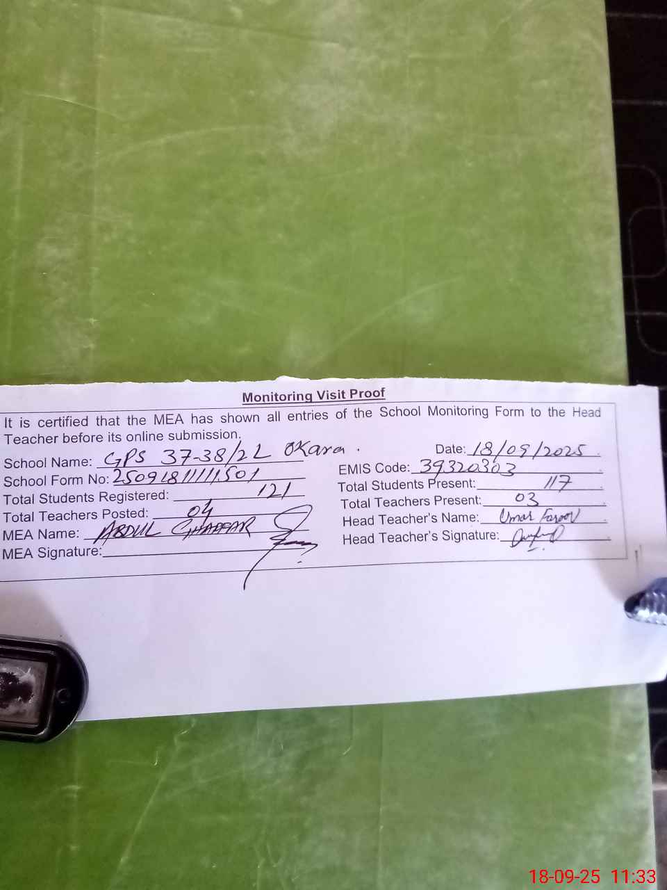 | Attendance Register | Head Teacher | MEA with School | Visit Proof |
