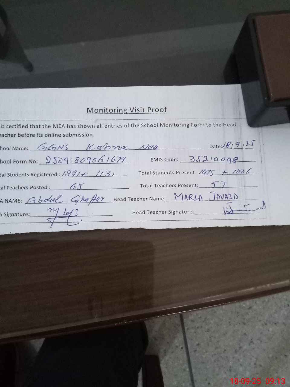 | Attendance Register | Head Teacher | MEA with School | Visit Proof |
