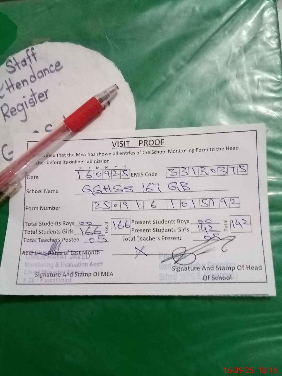 | Attendance Register | Head Teacher | MEA with School | Visit Proof |