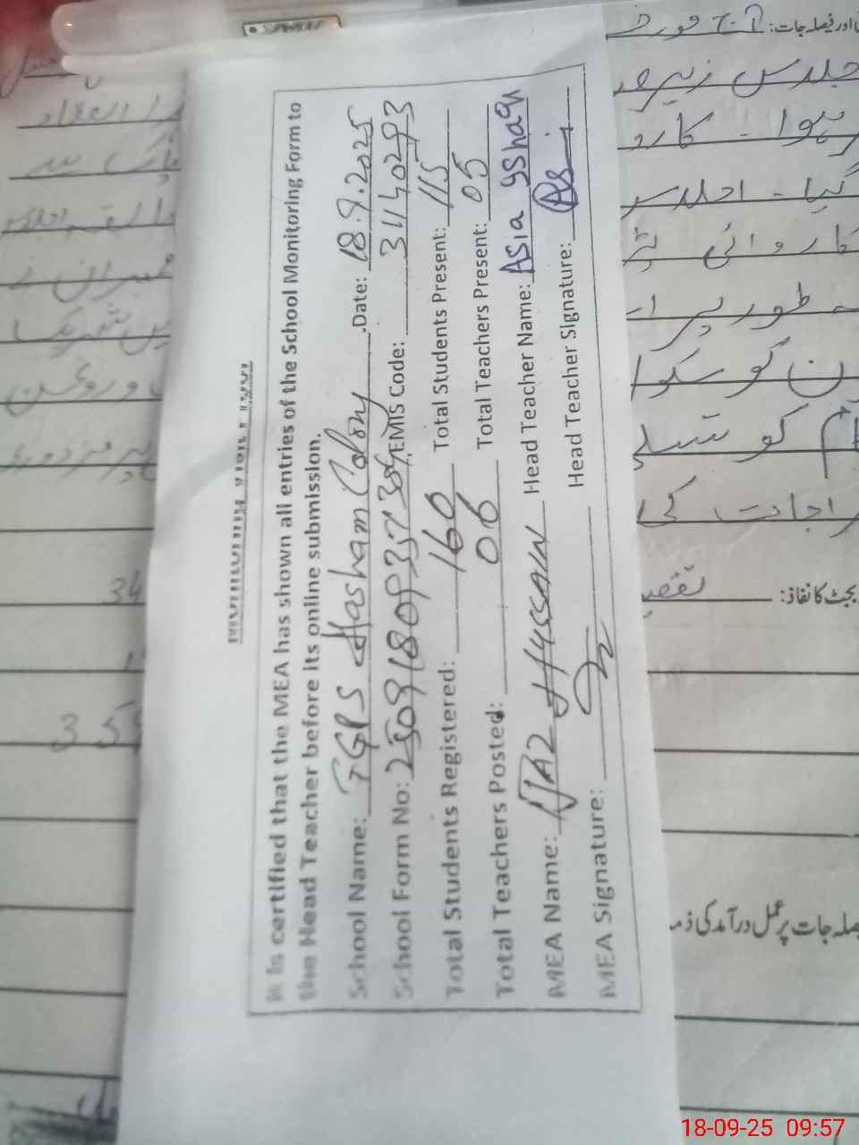 | Attendance Register | Head Teacher | MEA with School | Visit Proof |