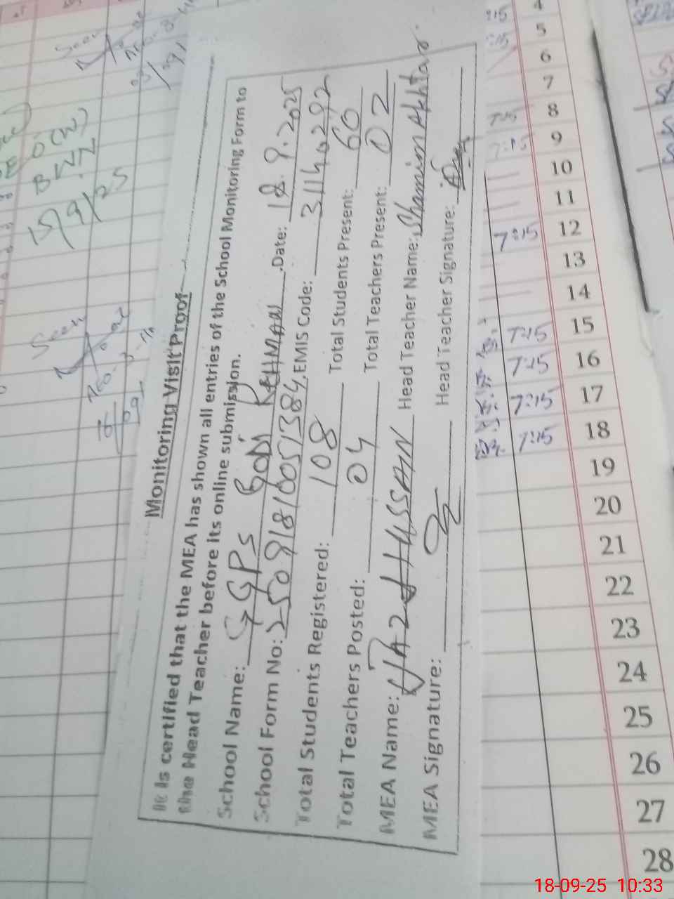 | Attendance Register | Head Teacher | MEA with School | Visit Proof |