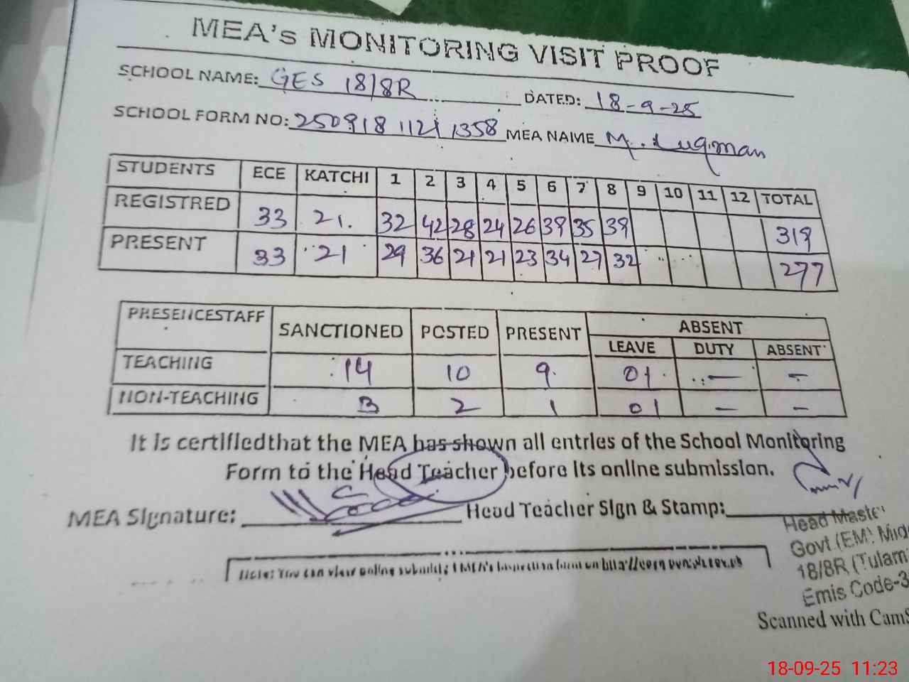 | Attendance Register | Head Teacher | MEA with School | Visit Proof |