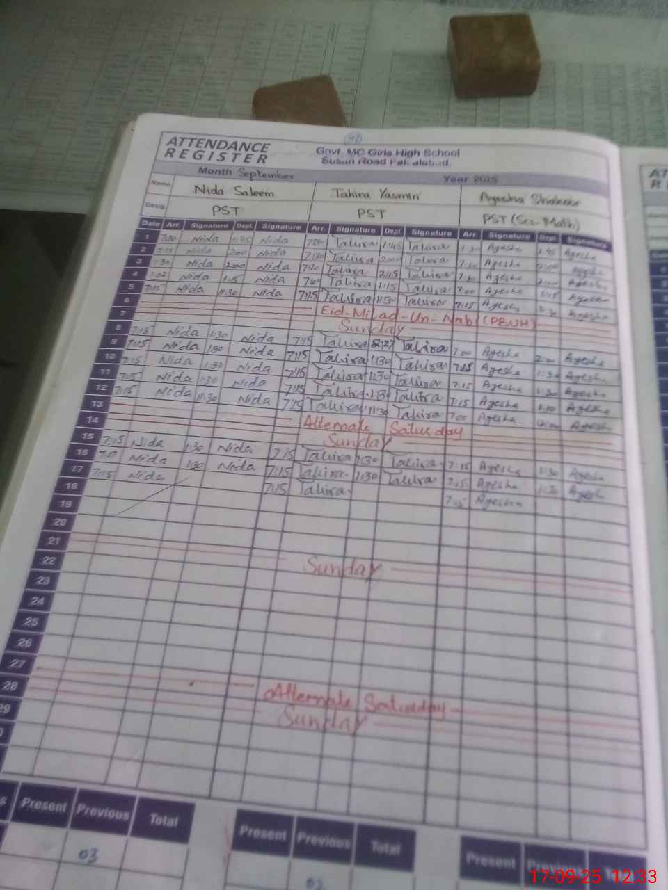 | No. of Students Present - Female | 0 | 0 | 40 | 65 | 45 | 74 | 55 | 65 | 90 | 95 | 122 | 149 | 110 | 910 | ||