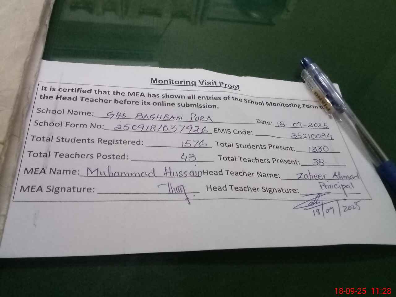| Attendance Register | Head Teacher | MEA with School | Visit Proof |