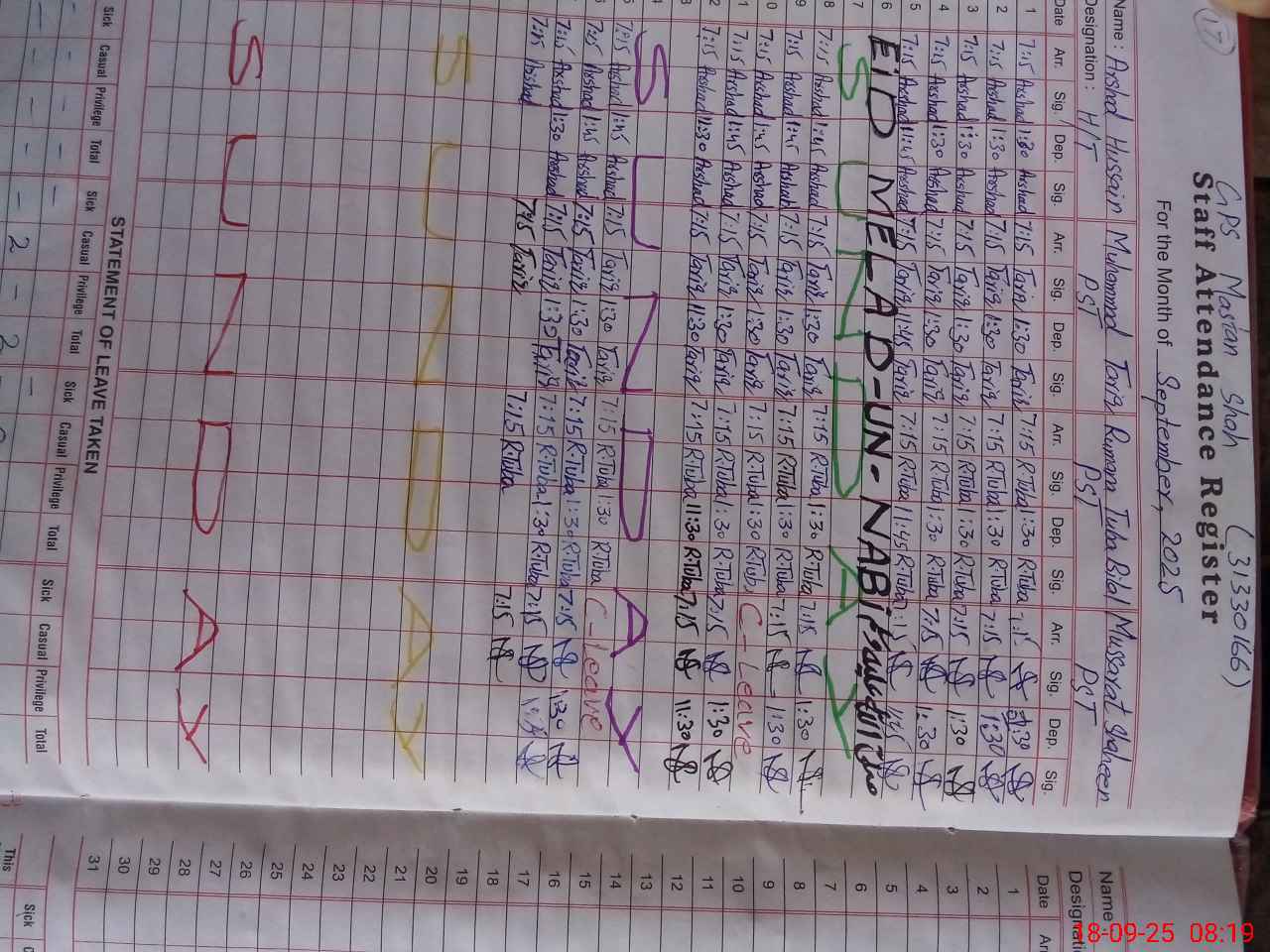| CNIC | Full Name | Designation | R/C | Absence During Last Calender Month |