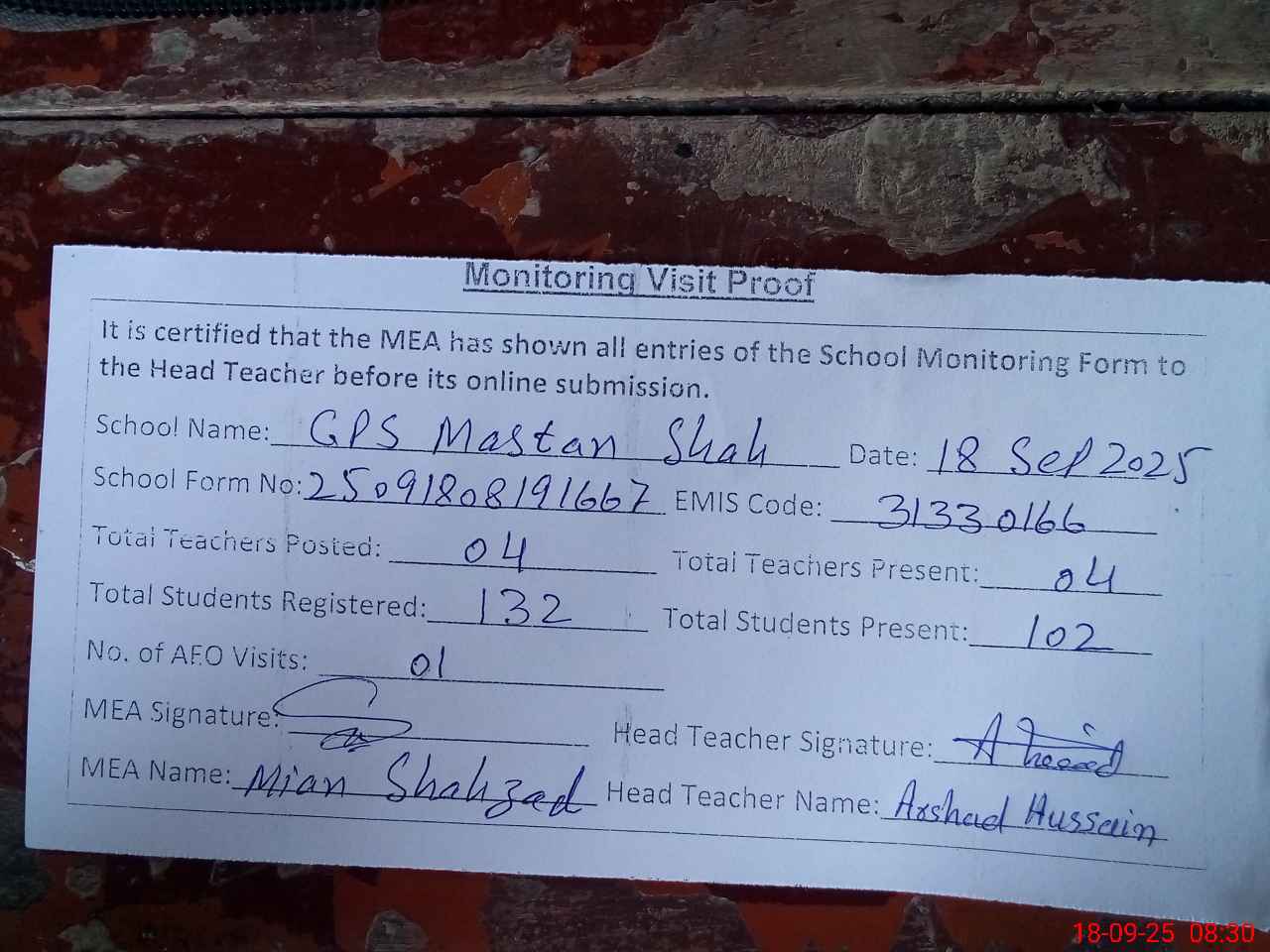 | Attendance Register | Head Teacher | MEA with School | Visit Proof |