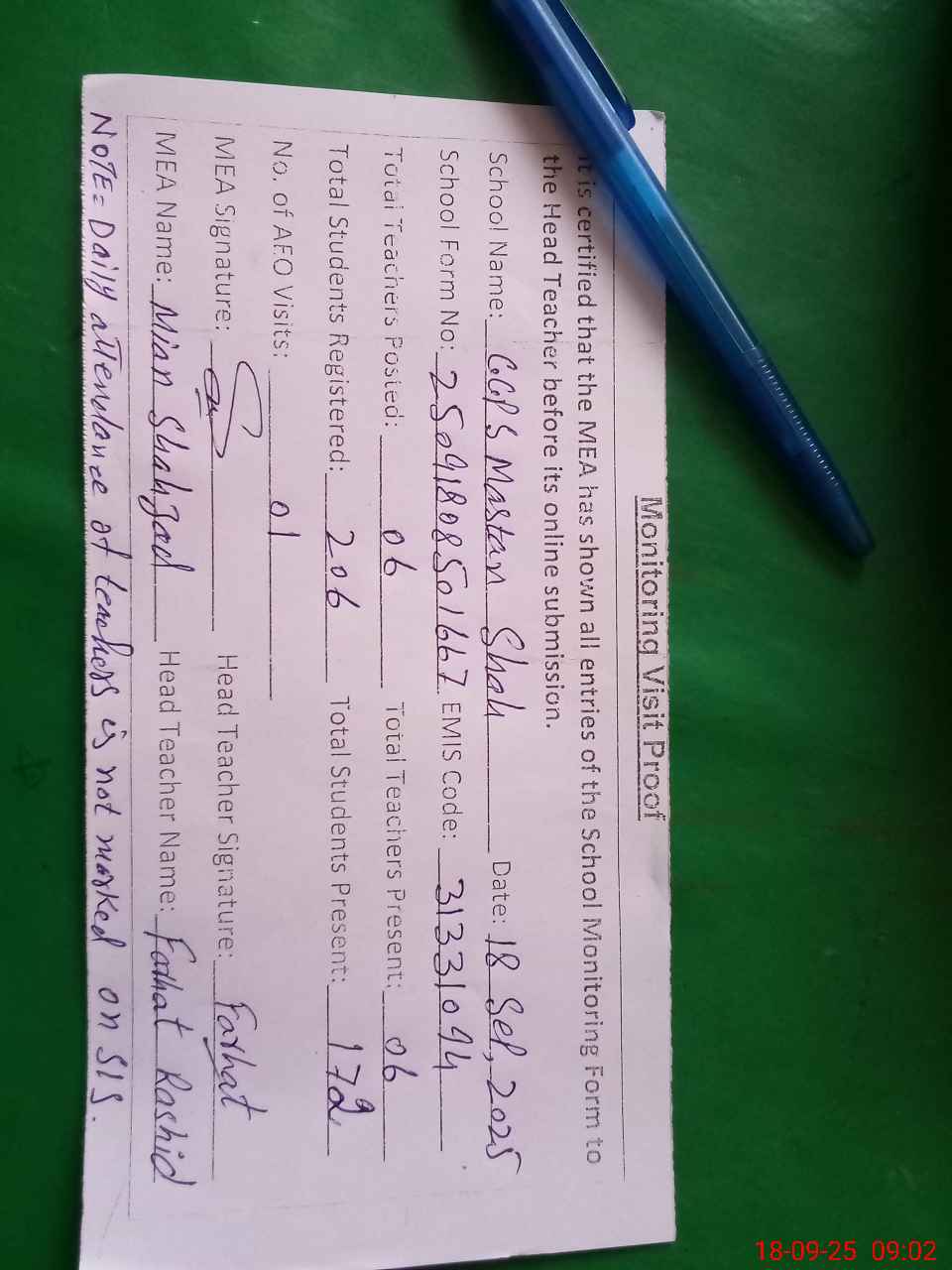 | Attendance Register | Head Teacher | MEA with School | Visit Proof |