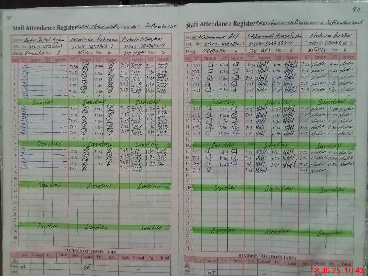 | CNIC | Full Name | Designation | R/C | Absence during last cal. month |