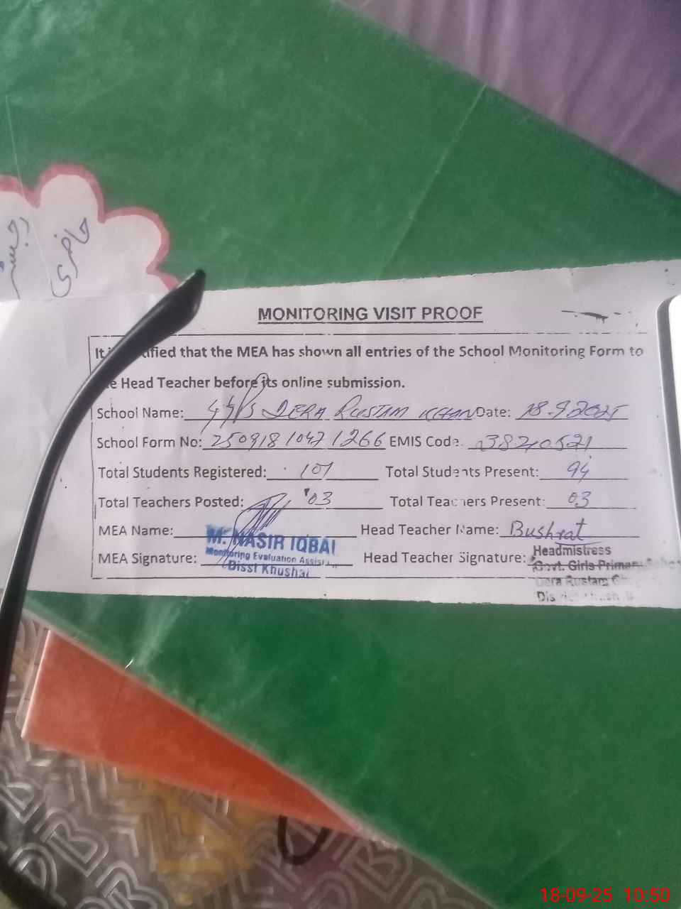 | Attendance Register | Head Teacher | MEA with School | Visit Proof |