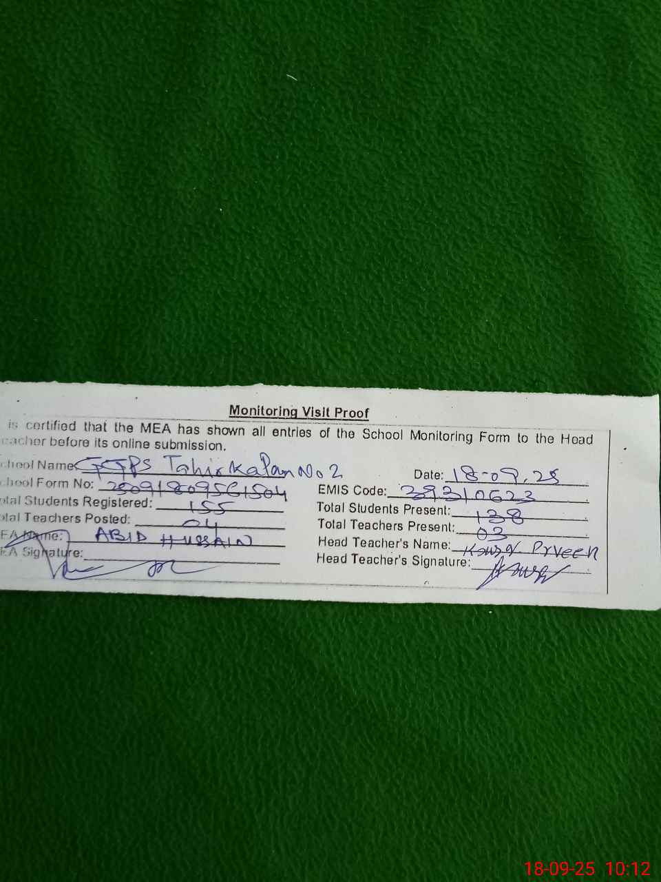 | Attendance Register | Head Teacher | MEA with School | Visit Proof |