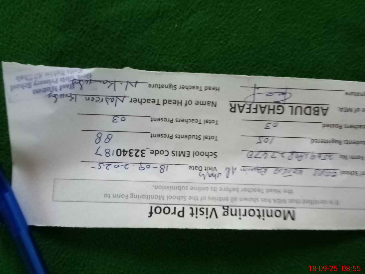 | Monitoring Date: 18-09-2025 | Start Time: 18-09-2025 08:23 AM | End Time: 18-09-2025 08:56 AM | Name of MEA: Ab**** Gh**** | |