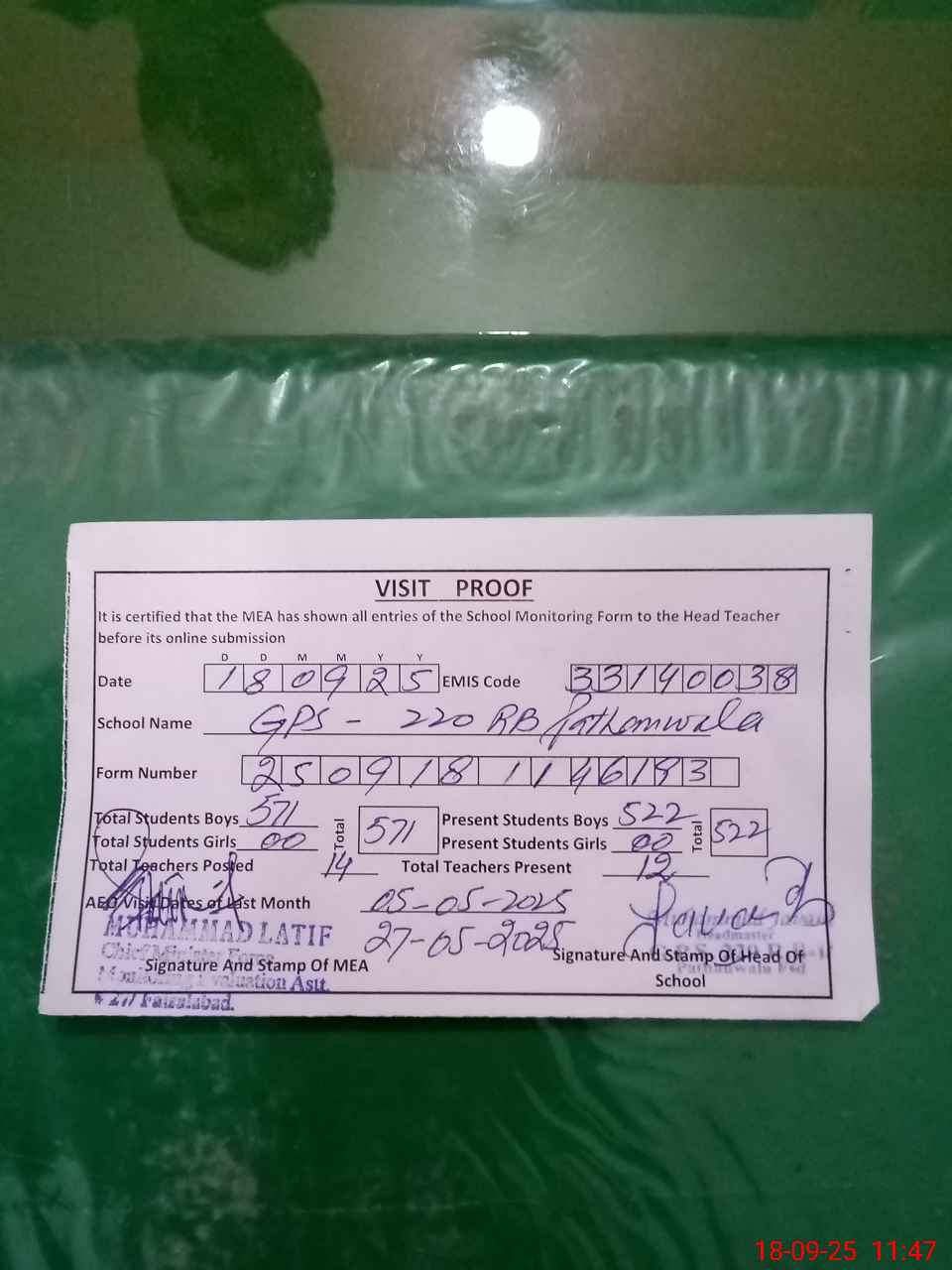 | Attendance Register | Head Teacher | MEA with School | Visit Proof |