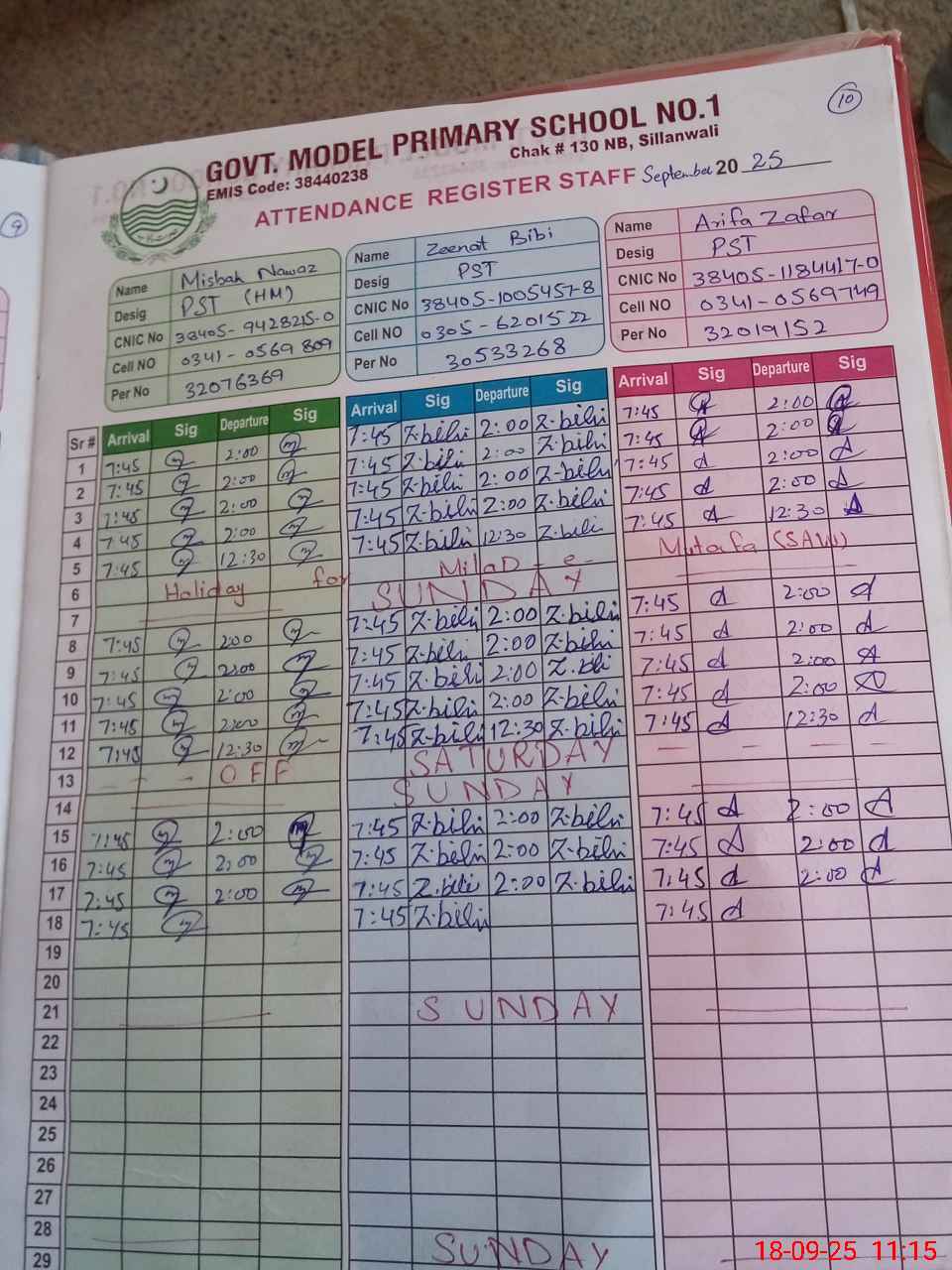 | CNIC | Full Name | Designation | R/C | Absence during last cal. month |