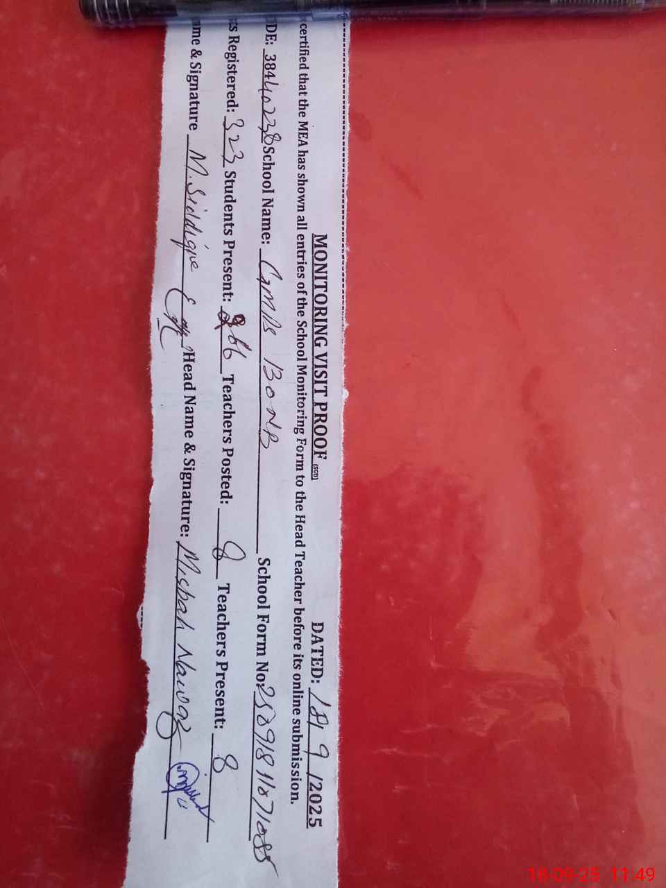 | Certified that this School was Inspected by the Undersigned MEA/DMO Today and the Information Stated Above is as Per Record. | |||||