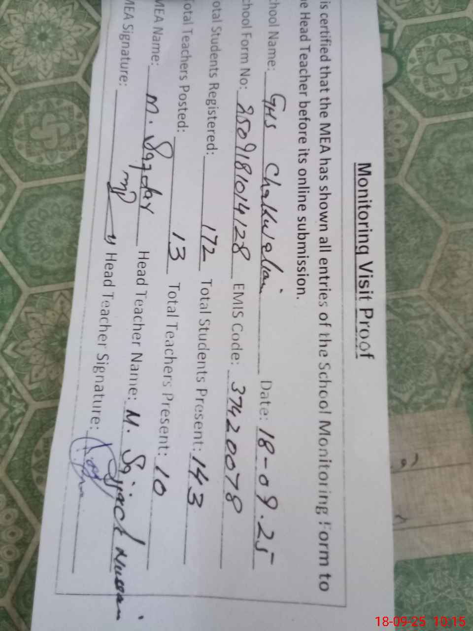| Attendance Register | Head Teacher | MEA with School | Visit Proof |