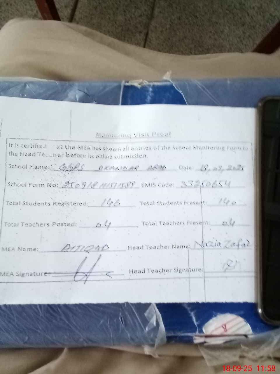 | Attendance Register | Head Teacher | MEA with School | Visit Proof |