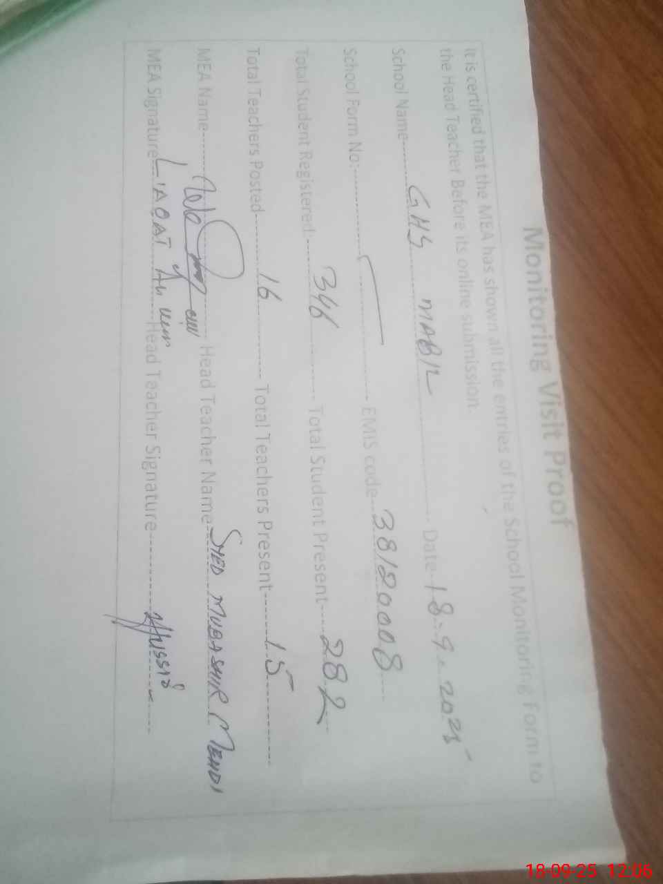 | Certified that this School was Inspected by the Undersigned MEA/DMO Today and the Information Stated Above is as Per Record. | |||||
