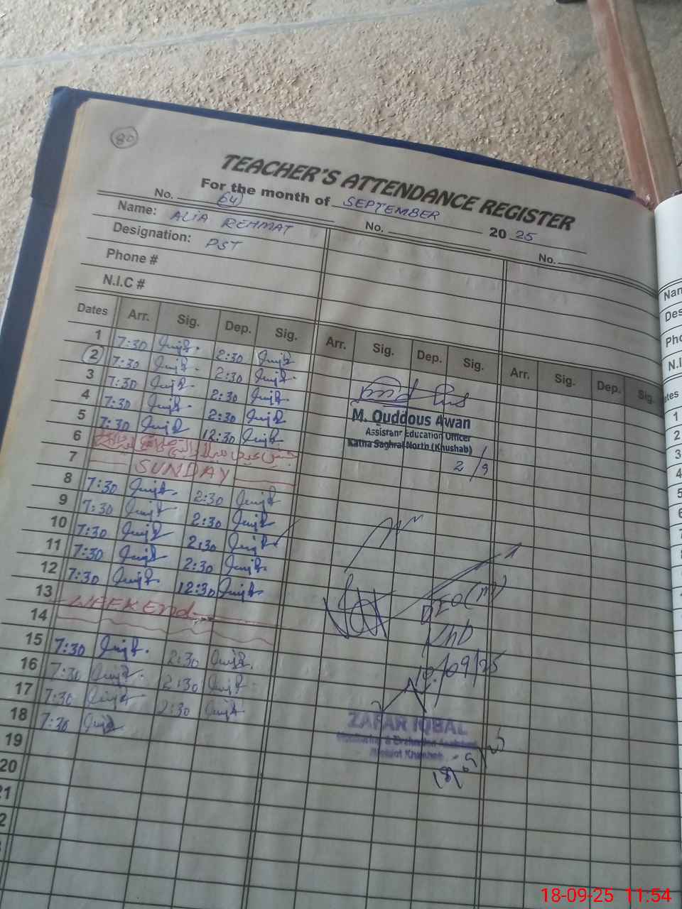 | CNIC | Full Name | Designation | R/C | Absence during last cal. month |