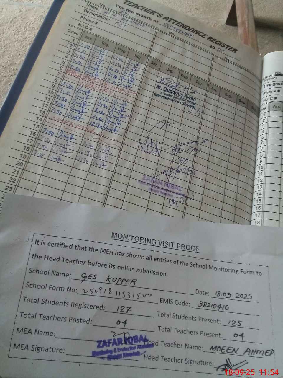 | Attendance Register | Head Teacher | MEA with School | Visit Proof |