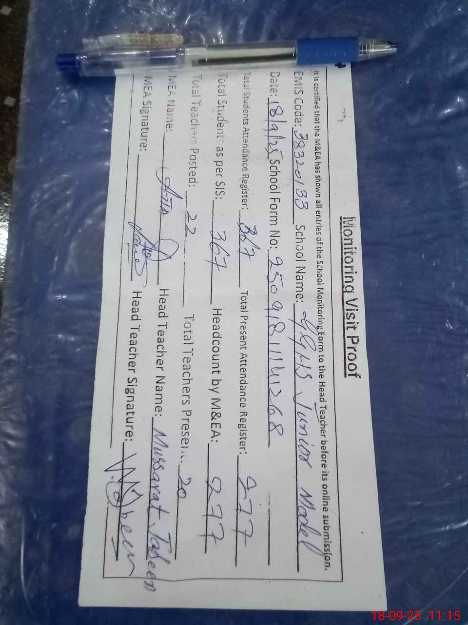 | Attendance Register | Head Teacher | MEA with School | Visit Proof |