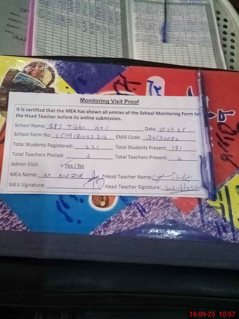 | Attendance Register | Head Teacher | MEA with School | Visit Proof |