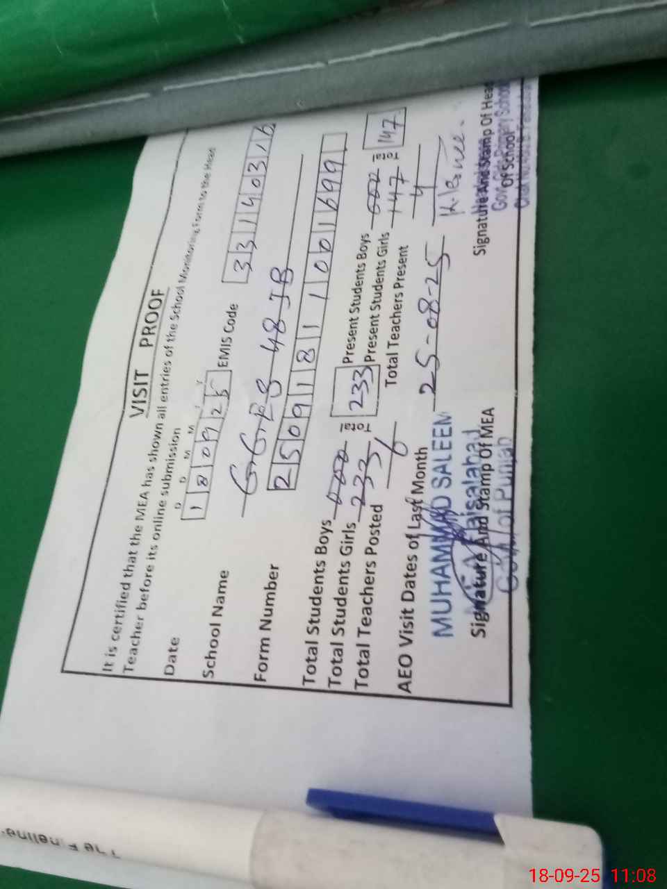 | Attendance Register | Head Teacher | MEA with School | Visit Proof |