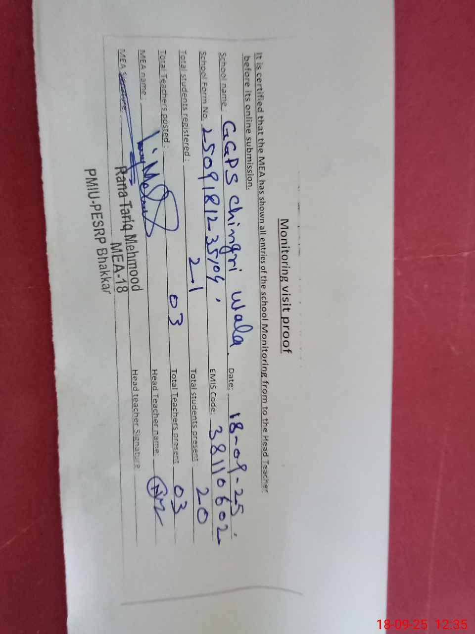 | Attendance Register | Head Teacher | MEA with School | Visit Proof |