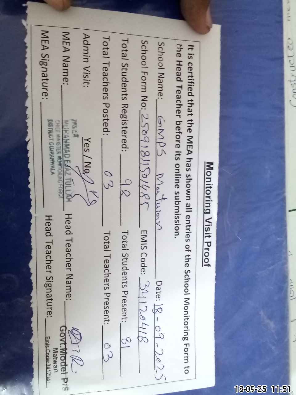| Attendance Register | Head Teacher | MEA with School | Visit Proof |