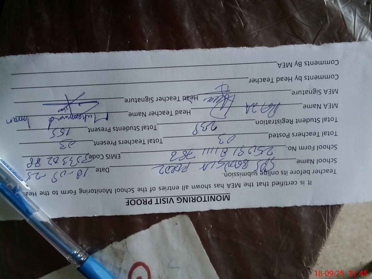 | Attendance Register | Head Teacher | MEA with School | Visit Proof |