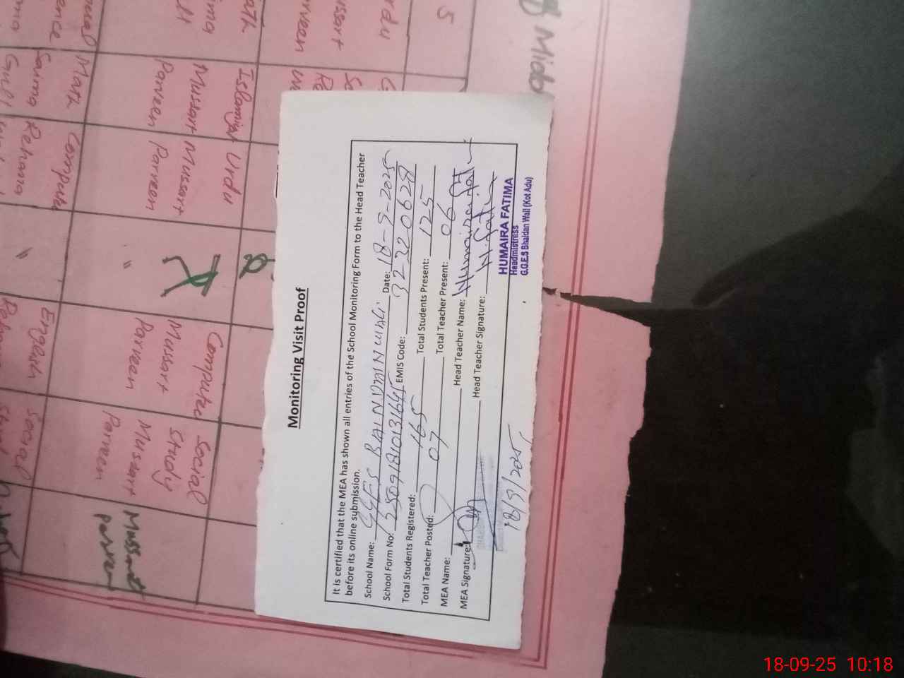 | Attendance Register | Head Teacher | MEA with School | Visit Proof |