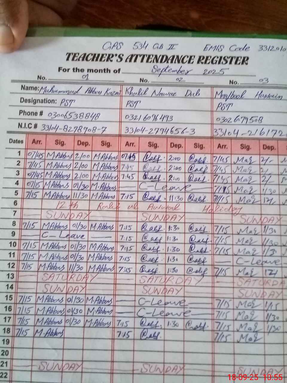 | CNIC | Full Name | Designation | R/C | Absence during last cal. month |