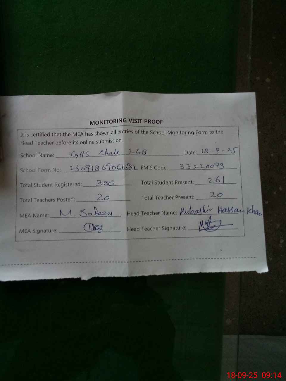 | Attendance Register | Head Teacher | MEA with School | Visit Proof |