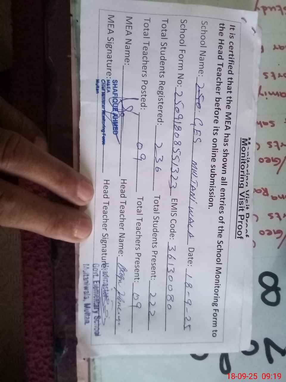 | Attendance Register | Head Teacher | MEA with School | Visit Proof |