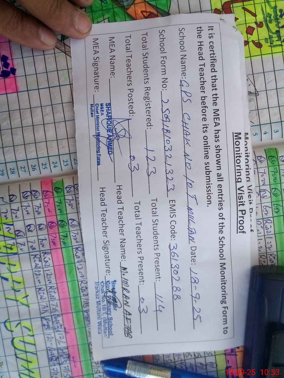 | Attendance Register | Head Teacher | MEA with School | Visit Proof |